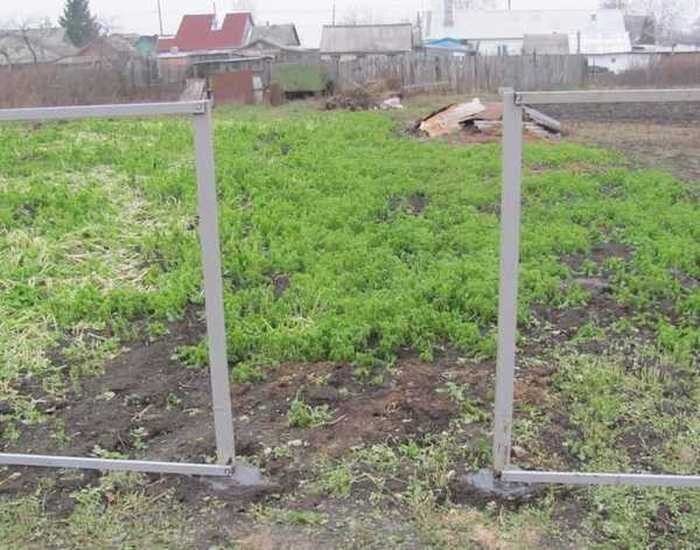 Сделать калитку своими руками несложно, для этого нужно иметь желание, немного времени, материал и инструмент. Здесь мы подробно расскажем, как сделать металлическую калитку в заборе из сетки Рабица. Итак, на дачном участке мы установили забор из сетки Рабица, натянутой между столбами из металла размером 6 на 6 см. Высота забора равна 1,5 метра . В месте, где будет висеть наша калитка, расстояние между столбами составляет 1 м, именно этой ширины достаточно для проезда мотоблока или садовой тележки. Когда вы будете планировать ширину своей садовой калитки, подумайте, для каких целей она будет использоваться. Материалом для калитки будет металлический профиль размером 2 на 4 см, который мы использовали в качестве лаг для забора. Поддержать автора материально можно здесь. Так как расстояние между столбами, где установим калитку, равно 1 метру, ширину калитки сделаем 98 см. Отрежем болгаркой два куска профиля по 98 см, они будут использоваться сверху и снизу, один кусок, равный 90 см, его
