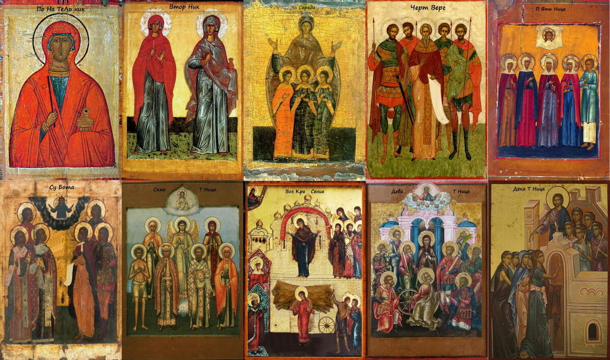 Теперь о иконах названиях настоящей декадной недели. Я уже писал в книге подробно о сути подмен дней недели с 10 дневной на семидневную. Святая инквизиц ия второго рейха перевела всех на семидневную. Это был символ победы. Великая французская революция возвращала ее ненадолго. Раньше было три выходных дня в неделе 5, 9 и 10. Девятый был ПХД – парко хозяйственный, банный день, так сказать. Просто банный – четверг. Казачество занималось своим военным предназначением, а женским днем был шестой, собирались поботать мерами объема накопленных новостей… 1. Есть такая икона с христианским названием Праскева Пятница. Умышлено перепутана образом перенесением в пятницу. Название Праскева – это пятница. Еще одна - Святая неделя. Якобы ничего не делать. Правильное название ее По На ТеЛь ник – граница НАчала дел. Все наоборот, как раз. 2. Эту икону, как и, впрочем, многие иконы в недельном ряду - христиане замалевывают разными святыми, собой и своими избранными. Кем только они не замалеваны… Якобы мученица Праскева и Анастасия. Правильное ее название - Втор Ник – повторять, вторить. 3. Эта икона Мать София и ее дети Вера, Надежда, Любовь. Правильно София – Соосная ось в Феразе (фите), то есть посередине. Софит, когда светит – это центр луча. Поэтому она посередине среди трех. Но она не считается, она образ, указка. Серед няя – средина в пяди-пятнице, в первой половине декадницы, средней между трех. Скажите мне пожалуйста, почему сегодняшний деградировавший человек не видит в слове философия – мужского и женского имени? Почему философия греческое слово и означает - любовь к мудрости? Филип – фиты линии. София – равновесие. 4. Очень редкая не замалеванная икона. Та, с мастями на копьях. Икона Цаца единственная осталась с подлинными копьями. Черт Верг – черт вержение из чертога. Вот тут с воинами стоит митрополит Илья. По христиански якобы Мардарий Севастийский. Самая десантная икона. Чистый четверг идет от традиции принимать баньку перед боем или походом. 5. Размалеванных икон этих куча. Как только не стыдно, всем матерям и женам пририсовали бороды, надели их платья и перестали пускать к алтарю, поставив стену. Видимо стыдно по началу было, позабылось и стали весить на эту же стену уже в наглую. Христианское название Иисус с избранными святыми. Правильно икона называется Праскева П Ять Ница – ять – окончание первой половины декадтницы. На Грузинском языке пятница – это параскеви. Вот где нужно имя Праскева. За пятник. Пядь - мера длины, которая равна расстоянию между пальцами ладони, отсюда пяльцы. На иконе как правило изображается молодая девушка пятой по счету, или девушка в военной одежде. Помните у Робинзона Пятницу? Я уже не раз рассказывал про ГРусьию и показывал сходство грузинского языка с сутью староверческих образов Руси. Грузия и Русь – это одно и тоже, и неразделимо. Сволочей политиков, которые пытаются нас разделить не нужно слушать, а нужно гнать… Мы даже не два дружных народа. По своей сути мы один народ. В наших понятиях живут те же нормы и названия староверия. 6. Полно замалеванных и этих икон. Тоже якобы шесть святых. Малкси либо во второго чудотворца, либо в себя любимого и святого замолевали. Су Бота – суженный разговор – сУженная Бота - ш Есть ница – новый щёт на второй руке. Время совещаний и женских посиделок. 7. Икона выжила у староверов наз