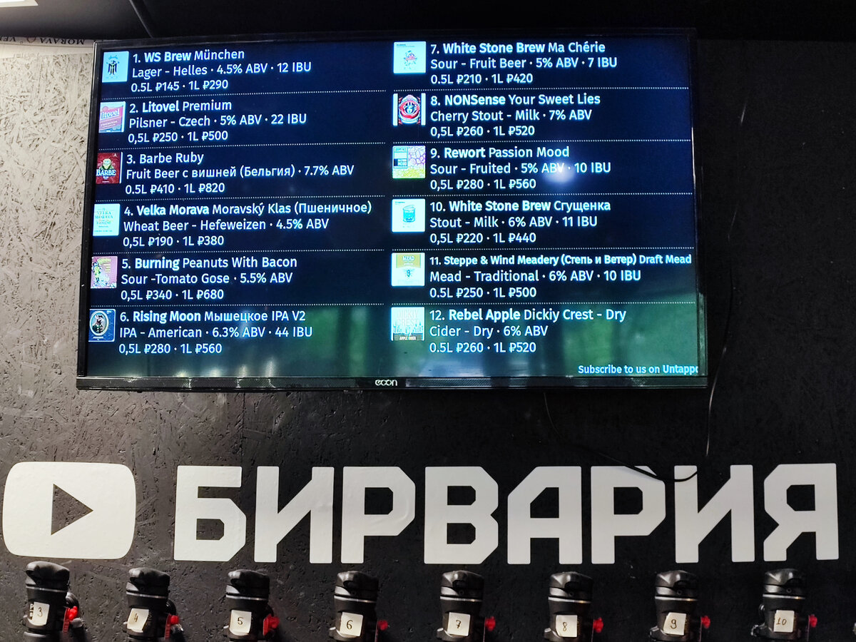 Сегодня перенесёмся с вами в Обручевский район ЮЗАО, чтобы для рубрики #ЛокалПабывЕбенях обозреть бар-магазин «Бирвария», который открыл ведущий одноимённого видеоблога Никита. Давать оценку его творчеству не буду, поскольку не являюсь зрителем шоу подобного формата. Но многим людям видимо проще не заниматься выпиванием пива из Красного и Белого, спортом и сексом самолично, а смотреть как это делают другие на камеру. Поэтому на стене бара красуется серебряная кнопка Ютуба. Бар из себя представляет небольшое помещение в жилом доме с аскетичным дизайном, примитивной мебелью, телевизором и искусственной зеленью на стенах. 12 кранов с разливным по 0,5 л в стакан и литру навынос. Сильная сторона — стена холодильников с большим и разнообразным ассортиментом пива, мидов и сидров по весьма милосердному прайсу. Кухни нет, только всякое вяленое да хрустящее на закуску. Периодически здесь проводят презентации и дегустации или другие придуманные ради очередного видео для канала мероприятия (на од