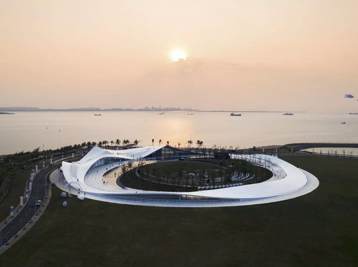 Бюро Sou Fujimoto Architects завершило павильон «Небесная гора» в Китае. Фудзиомото — мастер архитектуры, которая оказывается в центре внимания и вместе с тем как бы растворяется в природе. В этом комплексе, который предназначен для остановки в районе побережья Хайнаня, он также стер тонкую границу между естественным и искусственным — и дал путешественникам возможность блуждать между полянами, водой и местами для общественных мероприятий. Этот круглый павильон расположен среди прибрежного ландшафта провинции Хайнань. Его волнистая белая крыша повторяет изгибы береговой линии, напоминая силуэт холмистой горы. Дизайн передает плавность моря и безбрежность неба, создавая увлекательное взаимодействие между элементами природы. Когда посетители пересекают волнистую дорожку под крышей, открывается захватывающий вид на морской закат. Расположение белого кольца павильона приглашает гостей погрузиться в безмятежность природных пейзажей, когда солнце опускается за горизонт. Застройка павильона до