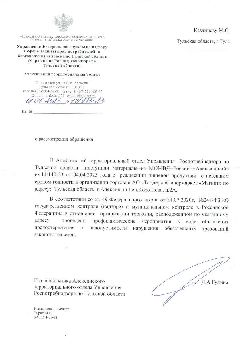 …часто говорите вы мне. Ну вот вам яркий пример того, как в городе Алексине, в магазине Магнит была вызвана полиция. Написано заявление, товар описан, и вот такой ответ от Роспотребнадзора: вынесли магазину предостережение.