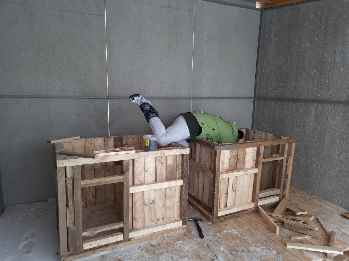 Мы уже писали ранее, что в 2015 году Администрация города Пскова передала АНЗО «Шанс» пункт передержки для безнадзорных собак. Практически все будки в нем были сломаны, и не годились в принципе, потому что были сделаны с тонкими стенками в одну доску. В нашем климате зимой температура опускается до -20, бывает -25, бывает даже ниже -30 градусов. Неутепленные будки не годятся для содержания собак. Глядя на сломанные будки, мы поняли, что их надо будет делать много, ремонтировать часто, при этом экономить на изготовлении без потери качества. Нам ничего не оставалось, как взять инструмент в свои руки. "Нам" – это, на тот момент, четыре отважные дамы – Мария, Анжелика, Лариса и Лена. Все четверо ни шуруповерт, ни дисковую пилу в руках не держали, не знали, как ими пользоваться. Подсмотрели, поспрашивали, попробовали… И дело пошло! Легкость и уверенность в руках пришла не сразу, но у нас стало получаться. Оказалось, распилить брусок и доски, собрать все это саморезами вполне под силу даже