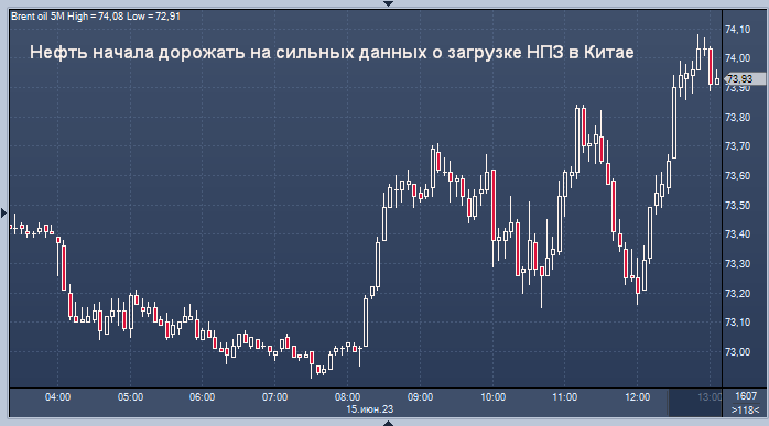 Бычьи факторы могут со временем возобладать над медвежьими, когда дефицит предложения станет очевиден, считают аналитики График цен на нефть марки Brent интервалами в 5 минут Цены на нефть растут в четверг после падения в среду, поскольку рынок отреагировал на скачок загрузки нефтеперерабатывающих заводов крупнейшего в мире импортера сырой нефти Китая. Фьючерсы на нефть марки Brent выросли на 87 цента, или на 1,19%, до 74,05 доллара за баррель в 12:58 мск. Американская нефть марки WTI также подорожала. Оба бенчмарка упали на 1,5% в среду. Рынок получил некоторую поддержку после того, как данные в четверг показали, что загруженность нефтеперерабатывающих заводов Китая в мае выросла на 15,4% по сравнению с уровнем годом ранее, достигнув второго по величине показателя за всю историю наблюдений. Ранее утром слабые экономические перспективы оказали давление на цены на нефть, поскольку рост промышленного производства и розничных продаж в Китае в мае не соответствовал прогнозам. Также сдержив
