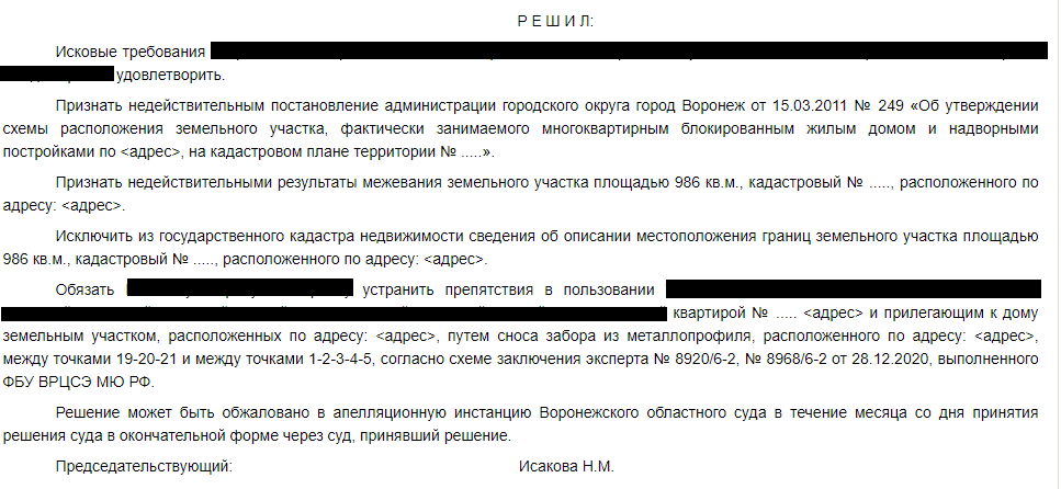 Несколько судом встали на сторону истцов, но кассация вынесла решение не в их пользу. В «Блокнот» пришло письмо от семьи, проживающей на улице Землячки. Воронежцы рассказали, что их частный дом замуровали сплошными заборами. Чтобы попасть к себе в жилище, людям приходится проходить через несколько дыр, которые им добродушно оставили соседи. Как это выглядит, сняли на видео: Как пояснила нам семья, весной 2020 года их соседи поставили забор, заблокировав их дом. – Заблокировали нашу семью во всех смыслах – прохода нет, дорога общего пользования перекрыта, заблокированы две машины – моя и жены, – рассказывает нам глава семейства. – Межевание проводилось в 2011году, но поставили забор только в 2020-м, тем самым нарушив наши права. Мы подали в суд. После полугода районных судов судья вынесла решение в нашу пользу (снести забор, снять с кадастра). Из картотеки Железнодорожного райсуда Апелляционный суд, со слов собеседника, вынес решение также в пользу заблокированной семьи. Но кассация не