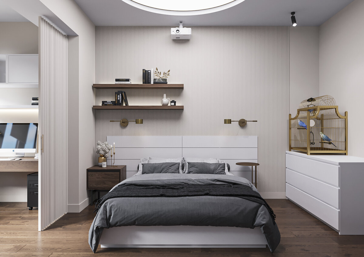 В комнате находится спальная зона, гардеробная и стена с проектором. Так как телевизор не помещался в комнате, и девушка не хотела его, мы сделали отдельно проектор, которым можно управлять, лежа на кровати.