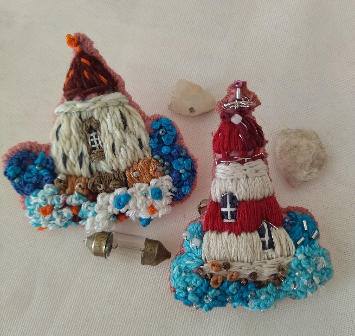 Здравствуйте все! Сегодня покажу самые первые вышитые брошки-маячки. Почему именно маяки? Потому что я их обожаю. И, к тому же, сейчас они в моде. Например, в Ленобласти проводят экскурсионные поездки к маякам, их много рисуют и фотографируют. А еще - это символ надежды. Вот два первых красавца. Один ношу сама, второй - подарен подруге. А теперь традиционно - процессы. В нитках, признаюсь, у меня всегда беспорядок. Творческий. Когда маячки вышиты, все бисеринки пришиты, я вырезаю изделие. Потом на заднюю часть нашиваю застёжку, две половинки сшиваю, поднабив синтепону. Конечно же, я планирую сделать много подобных маячков! Следите за новостями:))