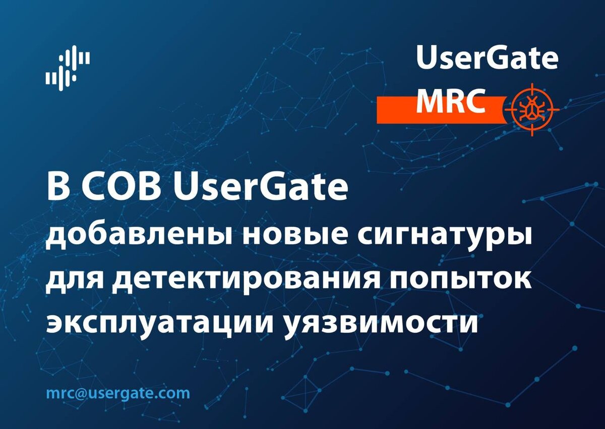 Сегодня в систему обнаружения вторжений UserGate добавлены четыре новые сигнатуры, позволяющие детектировать попытки эксплуатации опасных уязвимостей.