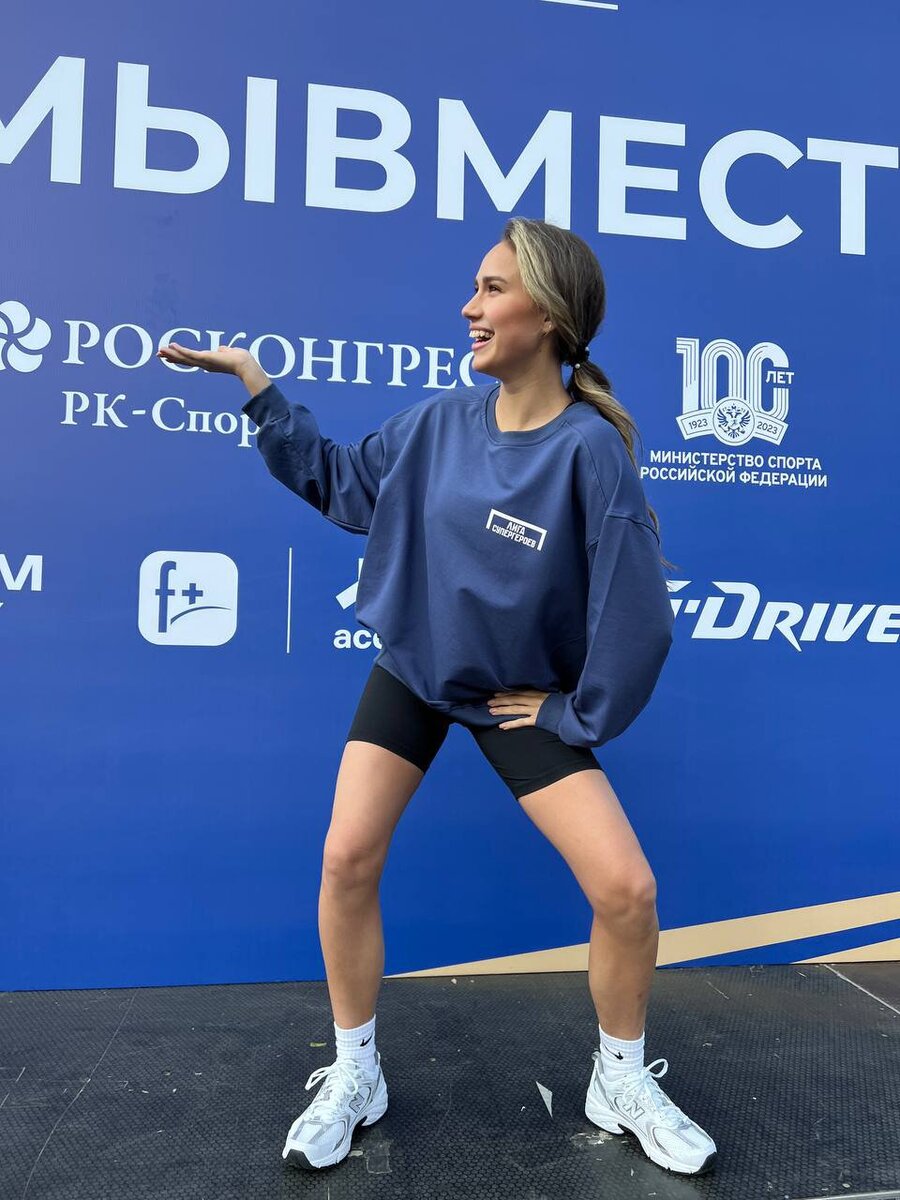 Начался день с зарядки перед забегом «Мы вместе». Загитова и гимнаст Артур Далалоян размяли участников маршрута на 5 км.