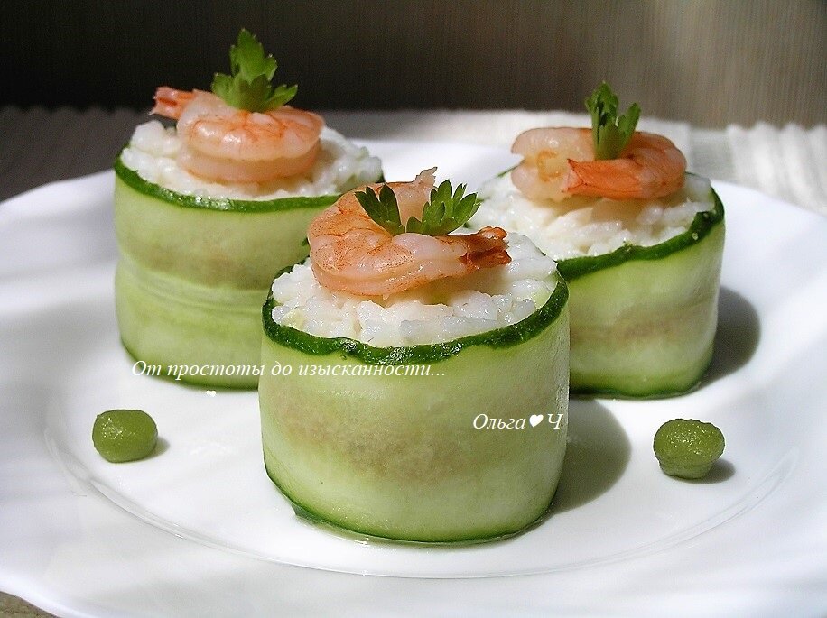 петрушка и васаби для подачи Приготовление: Отварите рис до готовности, добавьте сахар и уксус, осторожно перемешайте и накройте крышкой. Креветки отварите в подсоленной воде до готовности. Тунец разомните вилкой. Огурцы разрежьте вдоль пополам, уложите срезом вниз и с помощью овощечистки срежьте с огурца несколько полосок (до семян). Каждую полоску заверните в ролл. Мякоть огурцов измельчите и смешайте с рисом, добавьте васаби и майонез, перемешайте. Каждый ролл из огурца заполните чуть ниже середины рисовой массой. Выложите примерно 1-1,5 ч. л. тунца. Заполните до верха рисом.