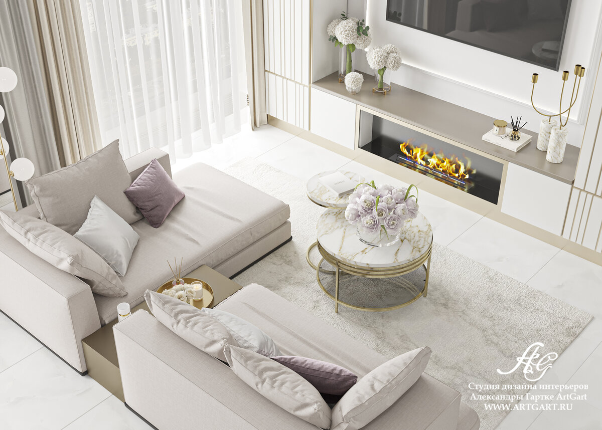 Светлая квартира площадью 73 метра для молодой девушки. Смотрите полный видео обзор этой квартиры: https://rutube.ru/video/58ff397ae655a96c4453a29485e8216b/ Квартира в светлых тонах, белая основа, бежевый и в небольших дозах приглушённый пыльно-розовый оттенок. Стены оформили рифлёными полиуретановыми панелями, которые чередуем с зеркалами и золотыми вставками. Между окнами обязательное в наших проектах зеркало, не теряем роскошную возможность усложнить пространство! Минимальное количество мебели. Столовая зона на 4 персоны, диванная группа с камином и кухня. Диван необычный: состоит из двух частей, одна из которых раскладывается. Столик поддерживает эту двойственность и тоже составной. Каминная зона получилось очень стильной: тумба, камин, рифлёные шкафы – очень гармонично. За телевизором молдинги с подсветкой. Свет во всём любимом нами многообразии: магнитные трековые, встроенные и подвесные люстры. Плитка на полу одинаковая во всей квартире с нежным рисунком мрамора. Раздвижная дв
