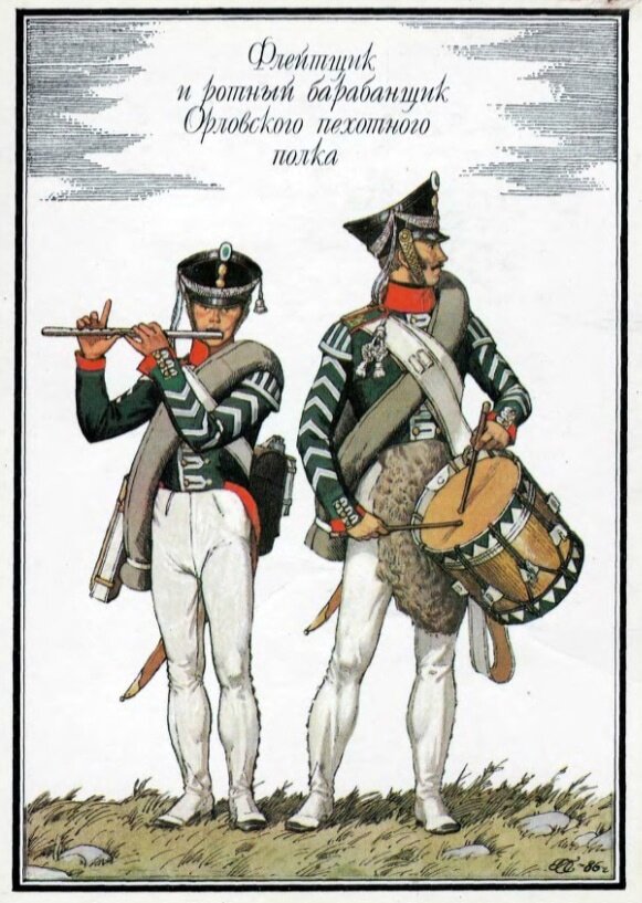 Нам же интересна открытка за номером двенадцать - Флейтщик и ротный барабанщик Орловского пехотного полка.