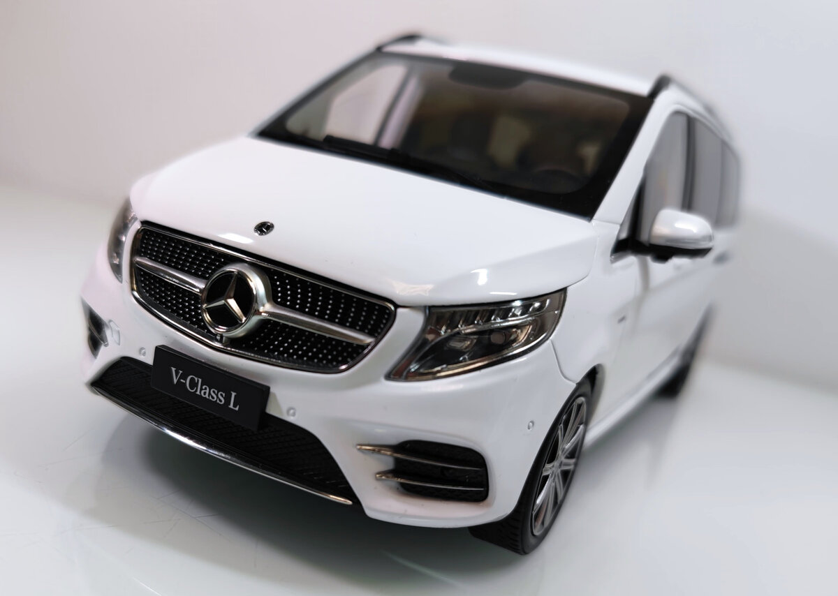 Производитель: China Model Материал: металлический сплав (diecast) Год производства модели/оригинала: 2023/2014 Статус: доступно к покупке Китайцы в очередной раз приятно удивили. V класс в 447-м кузове выпустила несколько лет назад компания Норев, но та модель меня не заинтересовала ввиду множества глухих элементов. В августе 2022 года в одном китайском магазине неожиданно анонсировали W447 с полным функционалом. Модель представлена в версии Executive Extra Long, то есть в самой роскошной и длинной версии. Я внес предоплату, ждал несколько месяцев и получил обратно не модель, а деньги. И вот, в марте 2023, модель вновь появилась в продаже в черном и белом цветах и в этот раз она была вполне успешно обменяна мной на деньги и быстро до меня добралась. На момент покупки было доступно только два цвета, о чем я и сказал в видео, но к моменту написания текста, появился еще и серебристый вариант, все с одинаковыми темными салонами. Китайцы, логично, представили основную версию для Китая. V26