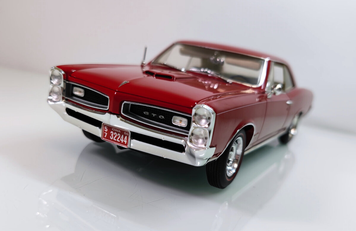 Производитель: Highway 61 Материал: металлический сплав (diecast) Год производства модели/оригинала: 2007/1966 Статус: мегараритет По понятным причинам в коллекции не так много Понтиаков, точнее, есть еще один Pontiac GTO 455 The Judge 1971, ну а GTO 1966 года, это обязательная модель для тех, кто собирает американские масклкары. Компания Highway 61, ныне уже приказавшая долго жить, начали выпуск модели в великом множестве исполнений в 2007 году, далее их бизнес подхватила компания Acme, так что общее количество произведенных моделей я так и не смог учесть. Конечно, старый добрый Хайвэй ценится коллекционерами выше новоделов от Акме GTO (американцы еще называют его goat – козел, что созвучно аббревиатуре на английском, но не очень хорошо звучит на русском) считается родоначальником масклкаров, хотя отдельные энтузиасты говорят, что первым был Oldsmobile 88 Rocket 1950 года. Вопрос дискуссионный. Большого дополнительного функционала у модели нет, но его все же значительно больше, чем, н