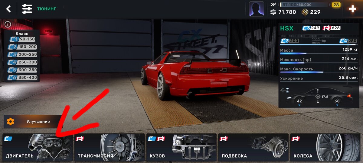 Я не буду все тщательно разжёвывать. Цель гайдов - помочь разобраться, что крутить и в каких случаях В игре двигатель определяет мощность и класс автомобиля. Вся мощь силового агрегата определяется по полке крутящего момента и мощности, она в основе определяет динамику. Именно благодаря настройке двигателя можно "подогнать" авто к требуемому классу клуба. Заменяемые детали Повышает все характеристики двигателя, увеличивает максимальные обороты и позволяет их настраивать. Не забываем, настройке подаются только детали с шестеренкой 2. Турбо кит - турбонагнетатель Чрезвычайно сильно повышает полку момента и мощности в определенном диапазоне оборотов. Двигатель по характеру становится верховым. 3. Распредвалы В большей степени влияют на высокие обороты 4. Впуск - впускной коллектор В игре нужен только для предотвращения провала мощности на предельных оборотах после установки ЭБУ Наличие данного провала (как на скриншоте) не допускается, особенно для машин, участвующих в дри