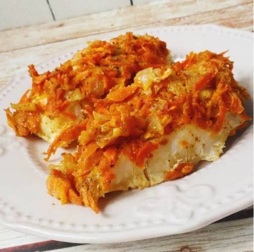 Противень застелить пергаментом, разложить рыбку. Каждый кусок рыбы сверху хорошенько покрываем морковно-луковой начинкой.