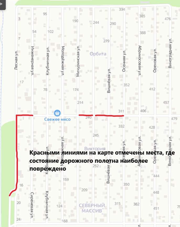 Садовые товарищества (СНТ) это свой особый мир, со своими интересами и заботами. Государственные мужи даже специальный закон написали как гражданам садоводства и огородничества правильно управлять товариществом и вести контроль за его деятельностью. Имущество общего пользования, в том числе и дороги, создаются и в дальнейшем содержаться за счет взносов садоводов. Вот и у нас пришла пора ремонтировать дороги. Дорога по ул. Центральная, расположенная между нашими СНТ «Орбита» и «Виктория», является собственностью товарищества «Виктория», но пользуются для проезда ею садоводы обоих товариществ. Поэтому и ремонтировали в «складчину» . Надо отметить общее состояние дорожного полотна по ул. Центральная и ул. Лесная (подъездная дорога к нашим товариществам) плохое, но есть места, где проехать можно только на «вездеходе». На рисунке отмечены красным наиболее «убитые» участки Ремонт начали 15 июня. Сделаны были следующие работы: - автогрейдирование с частичной нарезкой водоотвода от ул. Лесная
