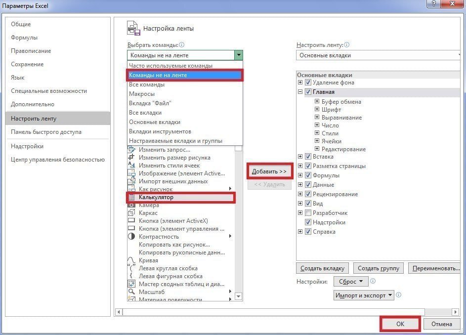 Если вы хотите иметь доступ к калькулятору прямо в программе — выполните следующую инструкцию: — Шаг 1 Щелкните правой кнопкой мыши по ленте меню и в появившемся списке выберите пункт Настройка ленты. — Шаг 2 В открывшемся окне во вкладке Настроить ленту под пунктом Выбрать команды укажите Команды не на ленте и найдите калькулятор в этом списке. — Шаг 3 Нажмите кнопку Добавить (справа), затем OK. Готово, теперь вы сможете открыть калькулятор прямо на главной странице