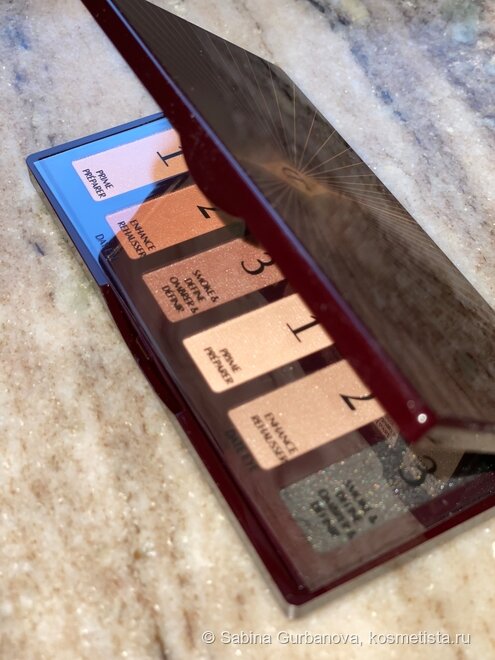Упаковка у палетки не самая презентабельная, но удобная. Небольшой пластиковый футляр размером с ладонь, удобное зеркало, закрывается крышка до защелки. Инструментов для нанесения не предусмотрено, каким-то тяжелым люксом тут и не пахнет, палетка больше напоминает что-то из категории профессиональной косметики. В палетке 6 рефилов теней и 7,2 г.