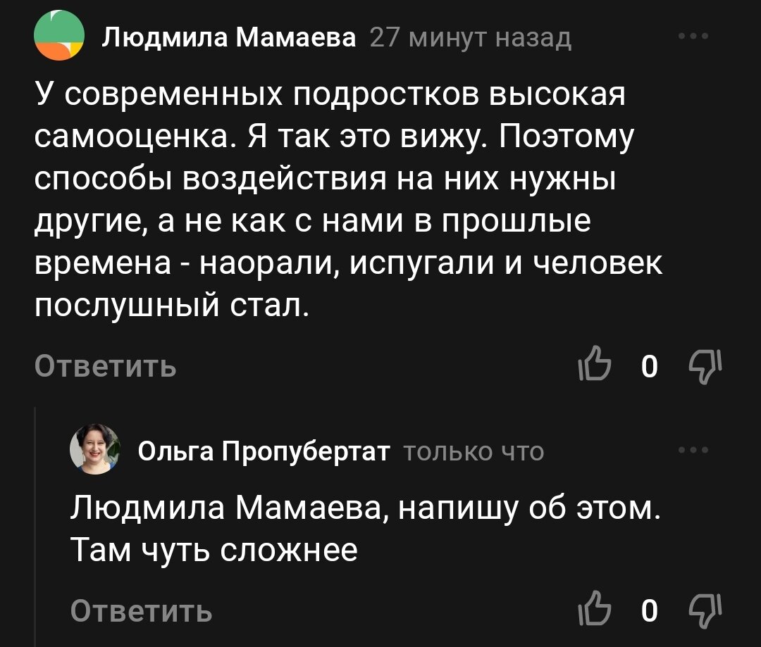 Самооценка это что? Оценка. Оценка это сравнение с идеалом. Ты лучше или хуже и насколько? А кто является вот этим идеалом? Но вот это - они просто хорошо о себе думают - неправда. Как раз человек которые НЕ уверен в себе ведет себя как король. Это мало кому понятный феномен. Но человек который по настоящему считает себя дерьмом, он чаще ведет себя внешне крайне понтово. Чтобы никто не догадался, как я плох на самом деле. Еще вот это "у современных подростков высокая самооценка" это чаще аналог раненого льва. Наши дети чувствуют, они ощущают, они понимают. Но взрослые к этому не готовы, взрослые прижимают к ногтю и ожидают послушания и подчинения. И если раньше мы скорее понимали, что родители старше умнее и доверяли бездумно. Мама сказала надо идти в экономисты, я и иду. Просто не было достаточно информации. То современные ребята через интернет ЗНАЮТ, что можно иначе. Знают про здоровые отношения и здоровую психику. И очень четко видят родительские манипуляции, родительские ошибк