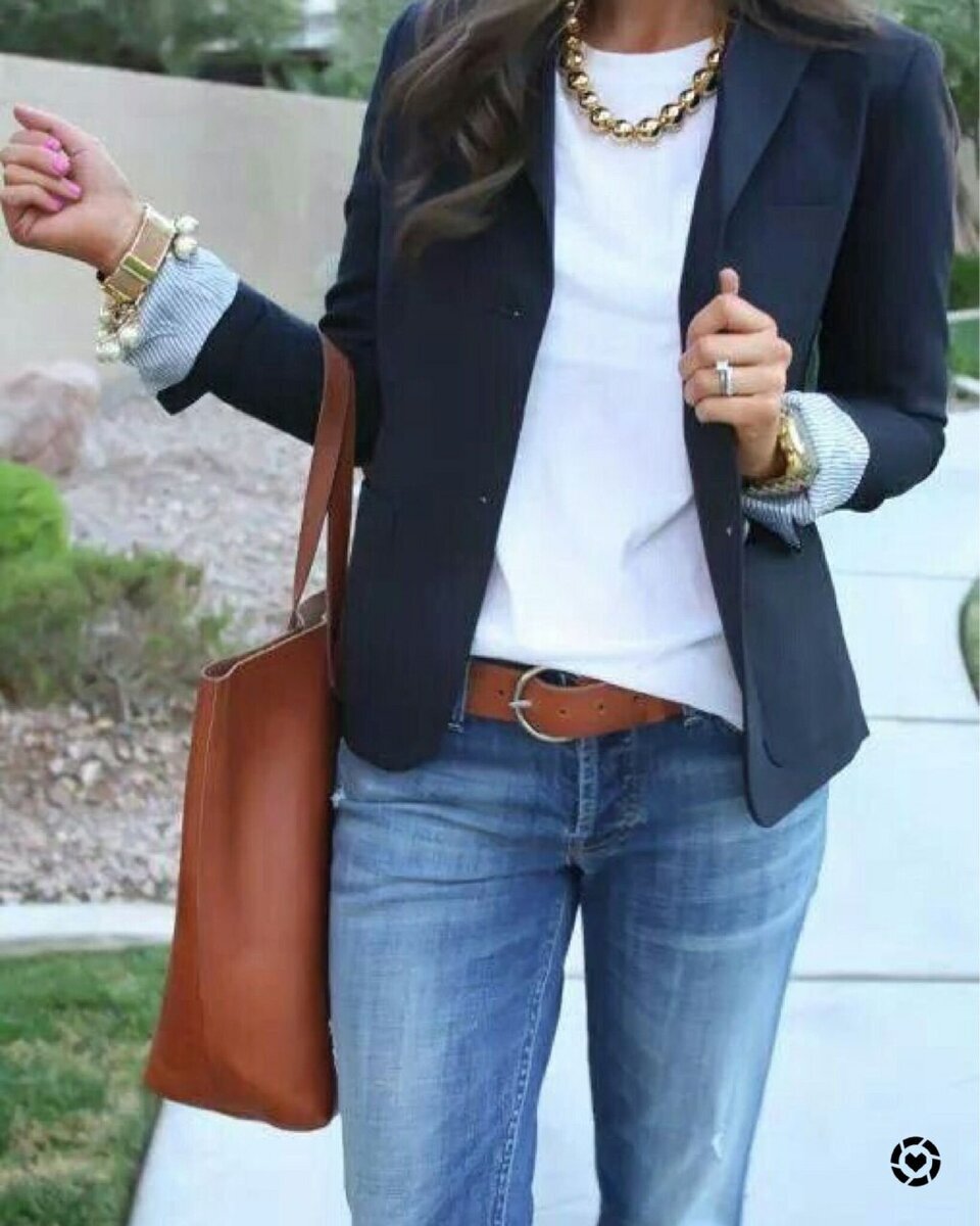 Базовый вариант - это пара светлых джинсов, белая футболка или рубашка и темный пиджак. Такой комплект уместен в офисе (если у вас нет строгого дресс-кода), на деловой встрече, на прогулке с детьми или с друзьями. Он также практичен, потому что вы можете снять пиджак, когда находитесь в помещении или в жаркую погоду, и оставаться налегке. Настроение образа зависит от того, какую обувь вы выберете. Например, кроссовки светлых тонов добавят легкости и энергичности. Сандалии или туфли на шпильке придают женственности и смягчают строгие формы и грубые структуры других нарядов.