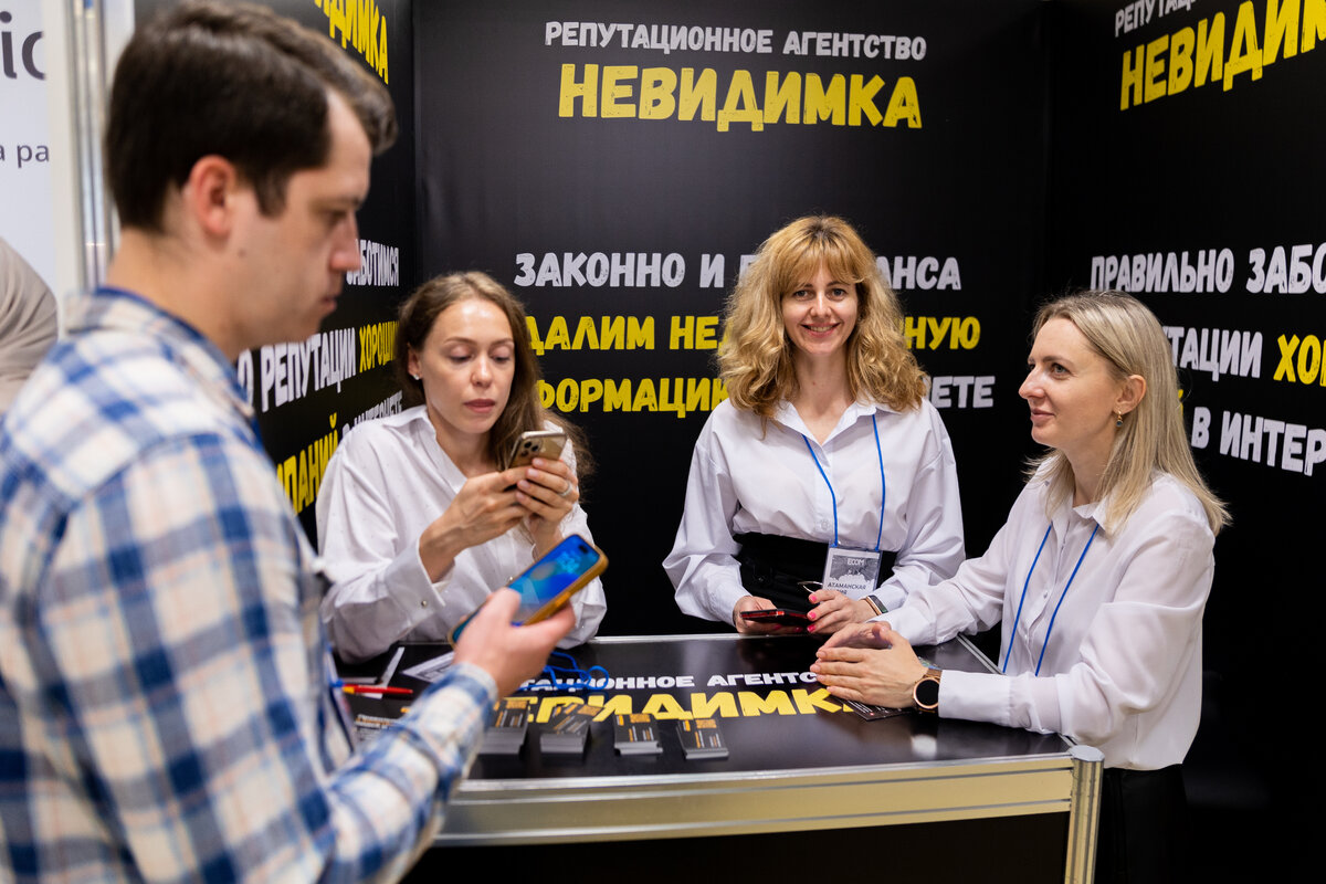 Брендированная страница в каталоге помогает посетителям выставки найти наш стенд. Масштаб выставки, в сравнении с 2022 годом, стал значительно меньше. Тем не менее, 234 экспонента и более 10 000 посетителей смогли принять участие в Оборот Expo 2023. В основном посетителей интересовало что делать с недостоверной информацией в интернете и очень позитивно реагировали на расширение услуг про SERM и PR в СМИ. Посещение выставки стало традицией для агентства Невидимка. Ждем новых встреч на Оборот Expo! На фото: Мария Атаманская, Юлия Гришина, Екатерина Титова.