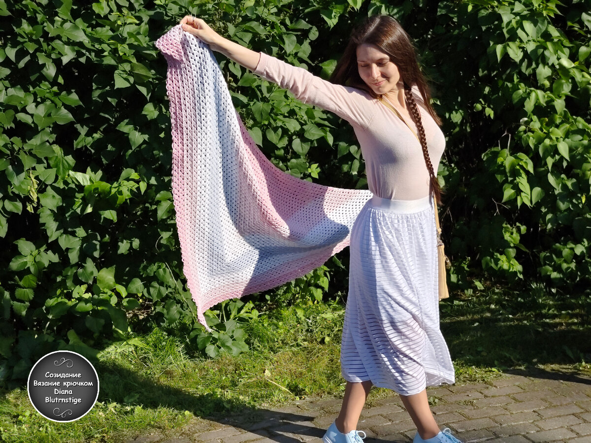 И я вязанье отсняла 😃 Довязала я этот шалебактус еще с месяц назад, но на улице было уже жарко для бактуса и еще прохладно для шали 😑 Пришлось ждать перевеса хоть в какую-то сторону Честно говоря, шаль я не ношу 😅 Вообще не ношу))) Т.ч. хоть и есть такая функция у данного изделия, но планирую использовать в холодное время как бактус на шею. Разумеется, без пуховика отснять как надо не получится, а делать съемку в пуховике в июне перебор 🤣 Осенью сделаю фотосетик с вариантом бактуса, а пока только вариант шали По вязанию ничего сложного тут нет, это обычный бабушкин треугольник. Я делала по три ссн + одна в.п. между ними. Угол формировала 3 ссн + 2 в.п. + 3 ссн. Начало ряда - 4 в.п. (петли подъема) + 3 ссн, а в конце ряда просто 4 ссн. Вот и вся простая схема ^_^ Использовалось 7 клубков, 4 цвета, крючок 3мм. Чтоб долго не перечислять и не писать текст, решила в этот раз просто сфоткать бирки))) На каждую полоску шалебактуса использов