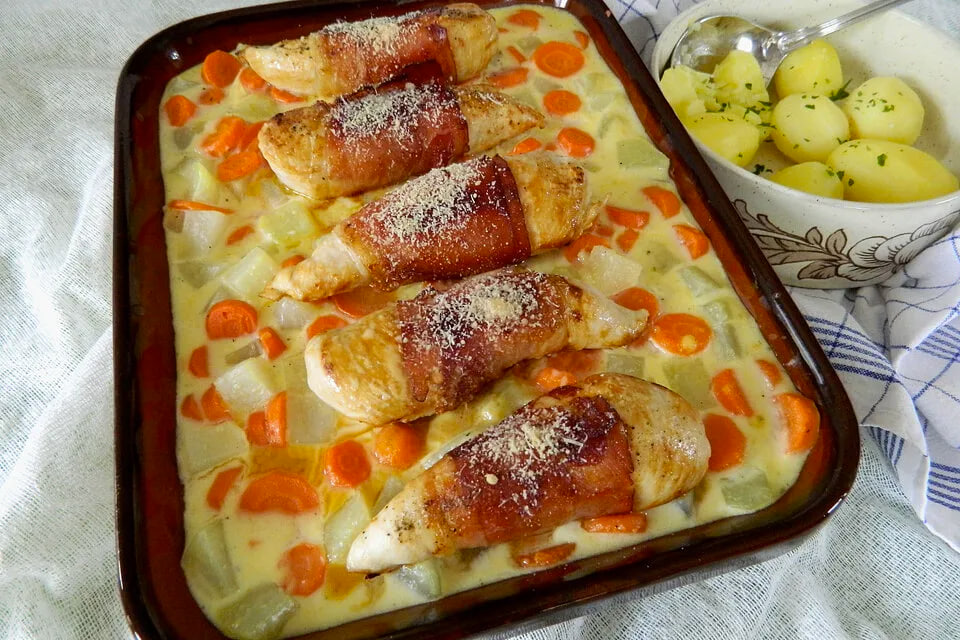 Или из репной капусты? В общем, из кольраби. А ее название, как известно, состоит из двух слов – репа и капуста. Так что каждый сам может решить, к чему кольраби ближе. К сожалению, кольраби у нас на столах гость редкий. Дорогая она, зар-раза, и на рынках, и в магазинах. Но иногда побаловать себя можно. Берем: Как готовим: Морковь и кольраби чистим, нарезаем. Морковь – ломтиками не толще 1 см, кольраби – кубиками со стороной максимум 2 см. Выкладываем в жаропрочную форму. Солим, перчим. Куриное филе обмываем, обсушиваем, солим, перчим, каждое оборачиваем посрединке беконом и обжариваем в небольшом количестве масла на хорошо раскаленной сковороде. Выкладываем филе на подушку из овощей. Теперь в сковороду вливаем овощной бульон и сливки, засыпаем сыр и прогреваем, пока у нас не получится соус – то есть, пока сыр не растворится. Заливаем соусом наше блюдо и отправляем запекаться – примерно при 160 градусах на 40-50 минут. Приятного аппетита!