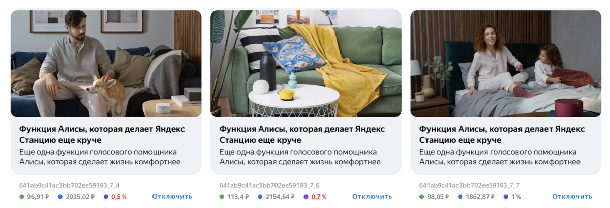 Яндекс Маркет запустил рекламную кампанию в ПромоСтраницах, чтобы анонсировать новую функцию колонки с Алисой. Нужно было рассказать пользователям, что колонка теперь может узнать статус заказа из Маркета. Что делали в начале Написали одну статью — Функция Алисы, которая делает Яндекс Станцию еще круче. Спустя 5 дней после старта кампании увидели, что из 15 обложек хорошо отрабатывает только 3. Их объединяет один общий заголовок: «Функция Алисы, которая делает станцию еще круче». В нем не раскрывали суть функции, и это мотивировало пользователей почитать статью. Лучшие обложки спустя 5 дней после запуска. Лучший CTR в это время колебался от 0,5% до 1%, а % дочитываний был максимум 38% В остальных вариантах заголовки были слишком прямолинейные — пользователю не было смысла читать статью, чтобы узнать подробности: Что решили изменить Оставили 3 лучшие обложки, остальные отключили. Придумали новые заголовки, похожие на самый успешный по показателям: Результаты после работы с обложками Оди