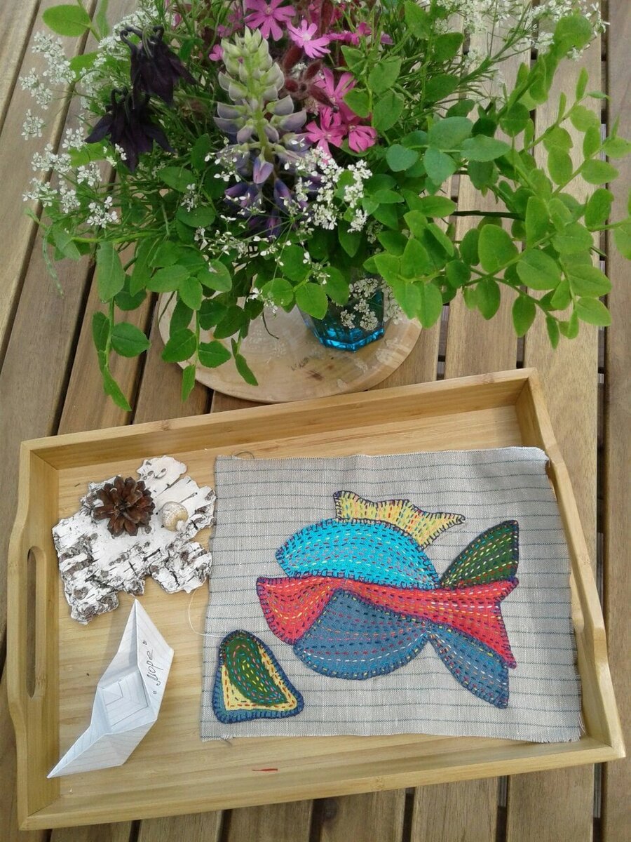 Вспоминаю "отдыхи" - и все они у меня с рукоделием. "Мама, ты только шитья своего много не бери" - упрашивает дочка каждый раз. А как не брать - оно же такое красивое, да? Это было в 2020 году, так же в середине июня. Тогда родилась туристическая база «Море» на мысе Киперорт, где мы с Алиной стали первыми гостями. Вспоминаю с нежностью! Каждый день я собирала в лесу новый букетик... И вам советую. Даже простые цветы, даже несколько веточек зелени сильно меняют ауру вокруг. Про букеты, королевские венки и влияние природы на творчество смотрите здесь: Если вы шьëте и настроились на нечто монументальное - например, проводите всë лето на даче и есть масса свободных вечеров - замахнитесь на сумку. А почему бы и нет? Вот вариант, хоть и не с рыбой, зато с китом! Вышивка - особая любовь. Стоит раз попробовать и остановиться невозможно. Такую вышивку создавать - как песню петь. Волшебно, бесконечно, радостно. И очень просто, посмотрите мастер-класс: Кстати, о фрагменте с рыбой с