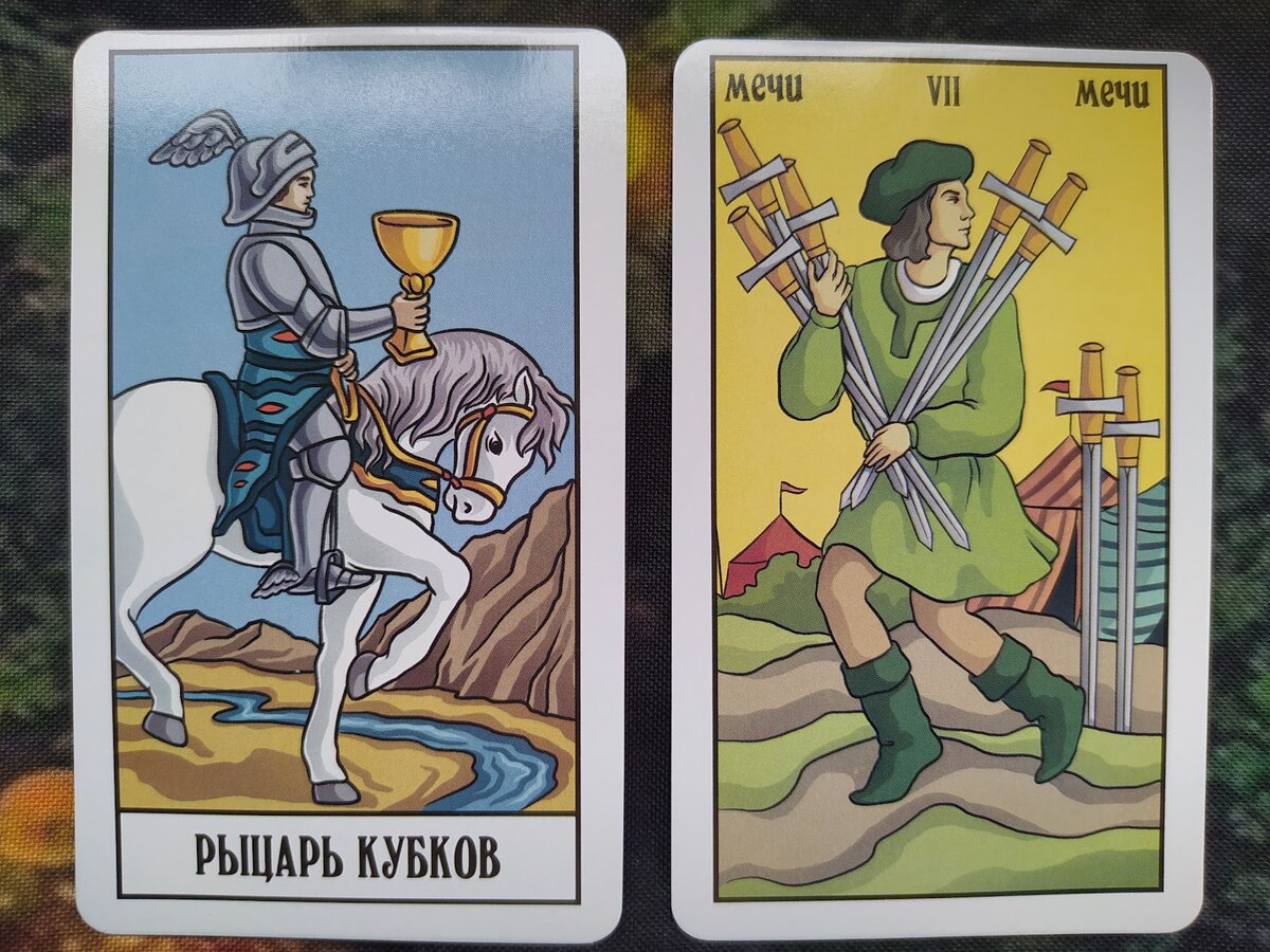 Здравствуйте, дорогие мои читатели. В этот понедельник - 19 июня нам предстоит приятное путешествие к своей мечте и ожидание, потому что нам достались карты Рыцарь Кубков и 7 Мечей. И так, разберём, что готовят нам карты? Как вы видите на первой карте, рыцарь в своём странствии подошёл к берегу реки. Сможет ли его конь преодолеть эту преграду? Возможно им обоим (и седоку и коню) придётся выбрать обходной путь. В любом случае, сейчас мы можем наблюдать некоторую заминку с исполнением поставленной рыцарю цели. И конь и восседающий на нём воин вынуждены остановиться, чтобы понять, каким способом лучше им будет перейти реку, прежде чем продолжить движение в заданном направлении. Кубки символизируют стихию воды. Наш Рыцарь держит в руке золотую чашу. Этот жест может отображать необходимость донести до адресата и передать ему важную информацию, хранящуюся в кубке. Также, вода это символ любви и радости. Тот, кто получит этот кубок, обретёт счастье. Но вторая карта также говорит нам, что
