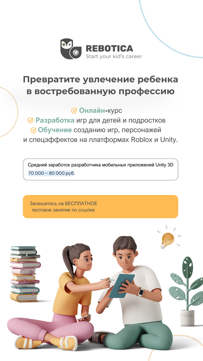 Разработчик игр, блогер, веб-дизайнер, 3D-модельер и программист — 5 it-профессий, которые можно освоить в онлайн-школе Rebotica всего за несколько месяцев летних каникул. На занятиях ребенок подробно узнает о каждой профессии, выберет интересное для себя направление и даже выполнит свой первый мини-проект. А родители получат ответы на интересующие вопросы и увидят, как проходит обучение.