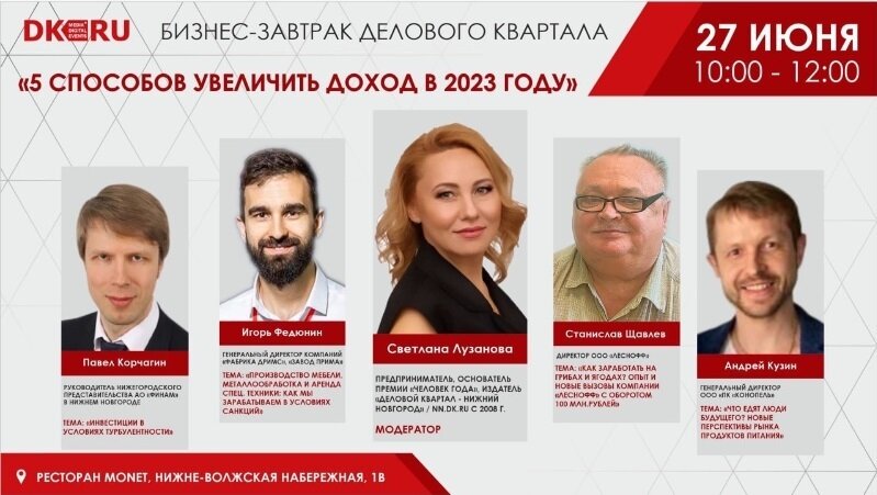 27 июня в Нижнем Новгороде пройдет бизнес-завтрак на тему «5 способов увеличить доход в 2023 году». Приглашаем руководителей и собственников компаний принять участие в мероприятии. Спикеры и выступления Павел Корчагин, руководитель нижегородского представительства АО «Финам» расскажет как и куда инвестировать в текущей ситуации, какой стратегии придерживаться и как снизить риски инвестирования. Игорь Федюнин, генеральный директор ООО «Фабрика Дримс», «Завод Прима». Он поделиться опытом работы компаний в условиях санкций, расскажет о том, какие направления приносят большую доходность и о работе на маркетплейсах. Андрей Кузин, генеральный директор ООО «ПК «Конопель» раскроет тему перспектив рынка продуктов питания и почему еда из конопли – еда людей будущего. Станислав Щавлев, директор ООО «Леснофф» поделится опытом, как начать бизнес с небольших лесных троп, собирая грибы и ягоды вручную, и достигнуть миллионного оборота. Модератором бизнес-завтрака выступит издатель «Деловой Квартал —