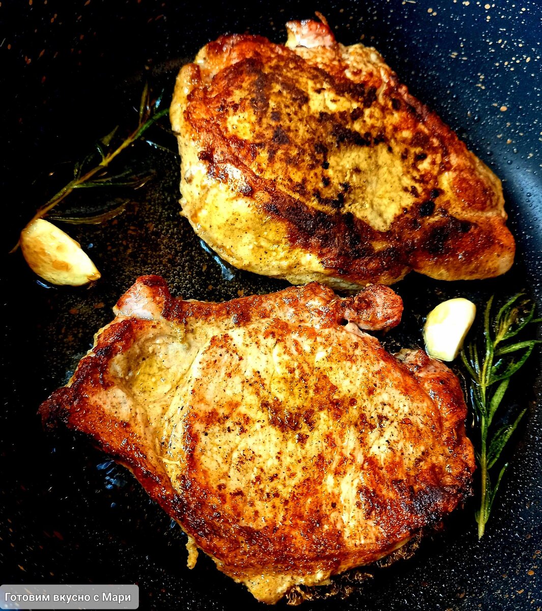 Начинаем жарить стейки - добавляем в сковороду чеснок (целый зубчик) и веточки розмарина, мясо обжариваем с каждой стороны до золотистой корочки - по 2 минуты, далее - под закрытой крышкой, убавив огонь до минимума - по 3 минуты. Выключаем и даем настояться - 5 минут.