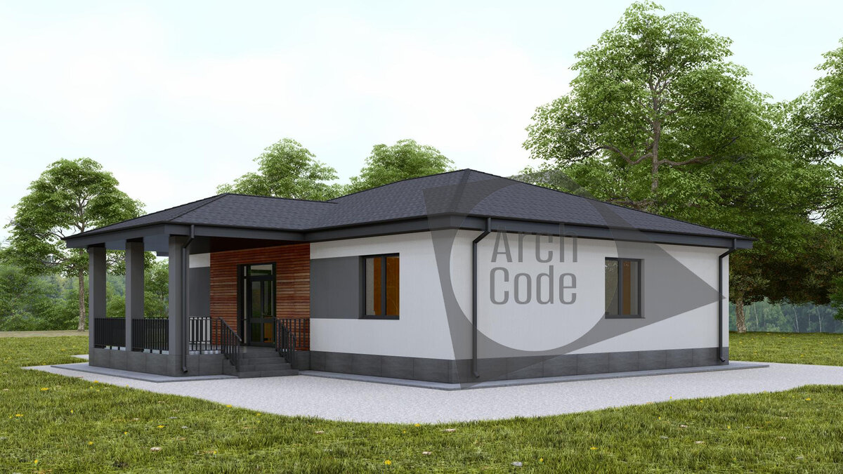 Представляем проект одноэтажного дома Площадь дома составляет 142.77 м2 Представляем вам просторный и стильный одноэтажный дом по проекту "Белла" общей площадью 142,77 кв.м. с террасой 23,57 кв.м. и крыльцом 3,07 кв.м.