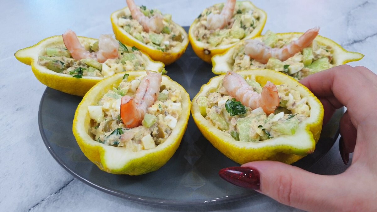 Как готовить: Длинный огурец очищаем от кожицы. И нарезаем на полукольца. Банку консервированной горбуши открываем и сливаем жидкость. Рыбку выкладываем на доску и измельчаем ножом. 4 вареных яйца нарезаем на кубики. Все ингредиенты выкладываем в миску. Добавляем маринованный лук. А также – нарезанные на колечки оливки и измельченную петрушку. Солим, перчим и заправляем майонезом. Берем три крупных лимона и разрезаем их вдоль пополам. Из лимонов вынимаем мякоть. Заполняем лимонные «чашечки» начинкой из рыбного салата. Сверху украшаем вареной королевской креветкой. Ура, праздничный салат готов! Приятного аппетита! Рецепт: - 3 крупных лимона - длинный огурец - 4 вареных яйца - горбуша в собственном соку - маринованный лук (половинка луковицы, 1/3 ч.л. соли, 1/2 ч.л. сахара, 1 ч.л. яблочного уксуса) - 12 оливок - петрушка - майонез - 6 королевских креветок