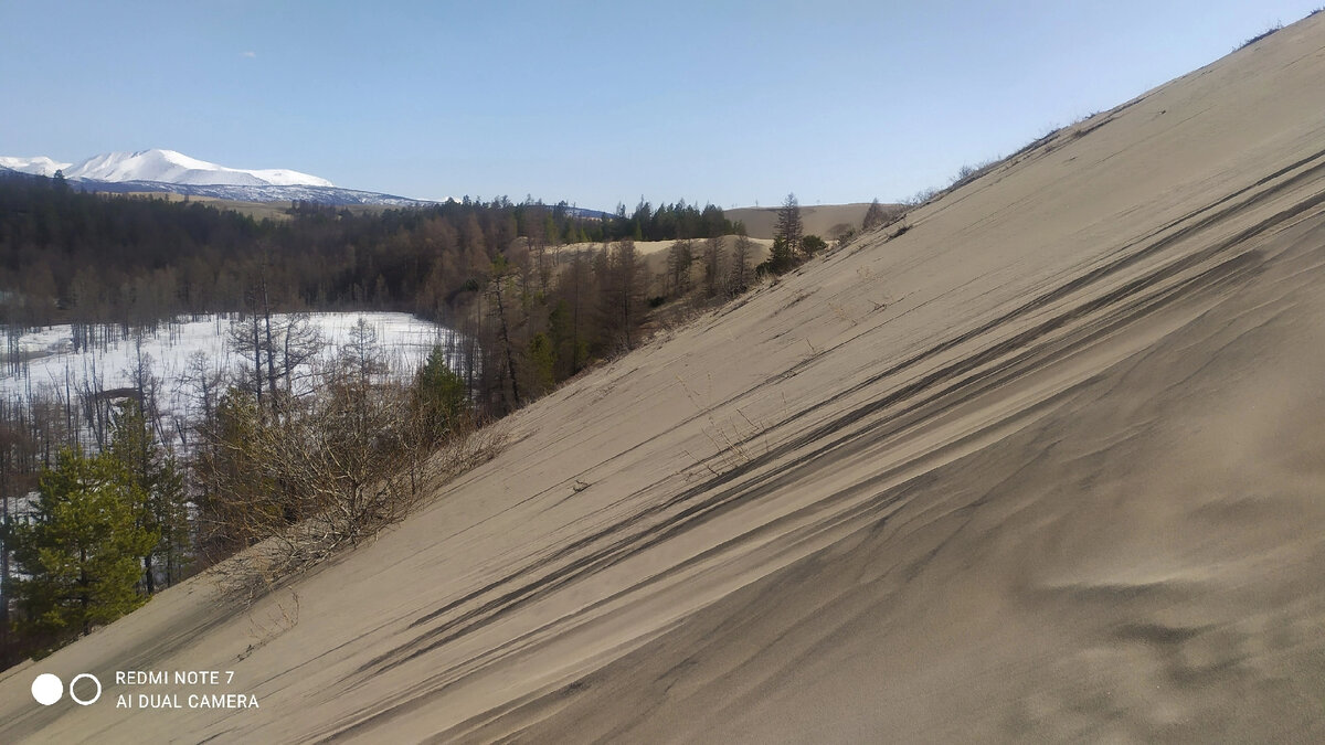 Пообедав и немного отдохнув, отправляемся "на разведку"- искать интересные места для заката и восхода солнца. В этот раз отправились на высокий бархан около лагеря. Прошли по ручью и снегу в низине. Пустыня понемногу оттаивает, появляются ручейки и проталины, а деревья стоят в воде как в вазе. Обратите внимание, как пески надвигаются на лес. Очень четко видно границу. В это время в пустыне цветут прострелы и порой трудно пройти мимо них, чтобы не сфотографировать Для заката приглядели бархан с четырьмя деревьями наверху. Растительность в пустыне есть. Некоторые растения - цветы, травки, деревья - растут прямо на песке. И поверх песка можно увидеть тонкие ниточки, как будто травинки прошлогодние. Это корни растений. Причем, очень прочно держатся, несмотря на внешнюю хрупкость. К нашему отъезду пустыня только -только начала зеленеть. А на этих фотографиях всё ещё кажется засохшими и безжизненным. В очередной раз любовались горами, закатным солнцем и гладью песка. В этот день ветр