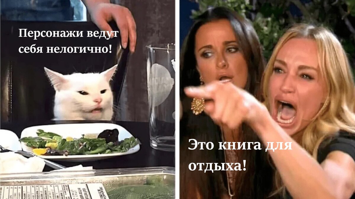 Довольно часто в последнее время я сталкиваюсь с утверждением, которое призвано защитить и обелить все логические несостыковки и просто некачественную проработку текста в книгах. Сто́ит только какому-то думающему читателю написать в комментариях: «Здесь герои ведут себя нелогично/ Это рояль в кустах/ События не стыкуются друг с другом», как тут же найдутся те, кто ответят: «Это же книга для ОТДЫХА! Ты можешь просто расслабиться и получать удовольствие, не вникая в глубины поступков героев?» Прямо мем вспомнился с котом и орущей девушкой. Вот так это, наверное, выглядело бы вживую, как на этой картинке: И, вы знаете, я впадаю в ступор от таких заявлений. Это что ж получается, литература для отдыха может быть низкого сорта? И это всех устраивает? Почему, за что так унижать книги? Я часто провожу параллель книг с едой. Это получается очень наглядно. Так вот, классическая, базовая литература равно базовая еда. Это — первое, второе (А компот?! — И компот!). А литература развлекательная,