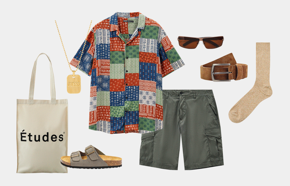 Рубашка Koton, шорты Marc O'Polo, подвеска Guess, ремень Olio Rosti, носки UNIQLO, сумка Etudes, солнцезащитные очки Matrix, сандалии Footwell