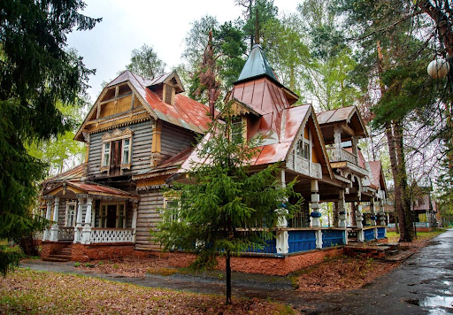 Все эти терема стоят на территории санатория им. Володарского, а один — чуть дальше, на территории бывшего санатория им. Кирова. И вот он уже был достаточно серьезно перестроен, от прежней красоты осталось не так много. Смотрите сами: