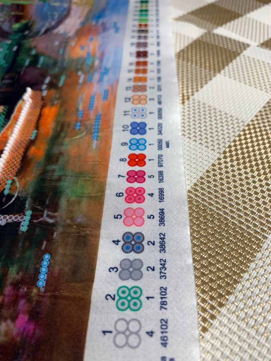 На полотне внизу, вы можете наблюдать множество непонятных цифр. Сейчас мы разберёмся, как смотря на эти цифры понять, сколько грамм и какого цвета нужно купить бисера. Будем разбираться слева - направо. 1-4-46102 1-это порядковый номер. Смотря на него, вы можете определить, сколько всего цветов вам нужно будет купить. 4-это количество грамм. Получается, что нам потребуется 4 грамма белого цвета(46102). 46102- это номер цвета по палитре бисера. Придя в магазин, вы увидите номер цвета, такой и нужно искать.
