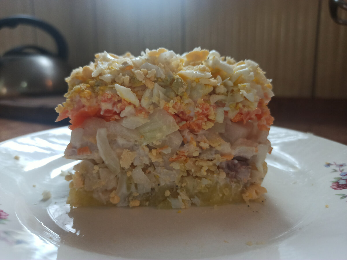 Постой и сытный салат с отварным мясом курицы. Рецепт: Мясо цыпленка - 1 кг. Лук - 3 шт Морковь - 3 шт Картофель - 10 шт Сыр - 200 г. Соль - по вкусу Перец черный молотый - по вкусу Яйцо куриное - 10 шт. Майонез - 300 г. Для маринования лука: Горячая вода (кипяток) - 250 мл. Сахар - 2 ч л Соль - 1 ч л Уксус 9% - 5 ст.л. Приготовление: Картофель и морковь очистить и отварить. Мясо курицы отварить (мы используем мясо, после варки для бульона на суп). Куриное яйцо отварить (варим 10 минут после закипания воды). Отварное яйцо очистить от скорлупы. Лук нарезать небольшими кубиками. В небольшую чашку переложить лук. Добавить 2 ч.л. сахара и 1 ч.л. соли. Добавить уксус - 5 ст.л. и залить кипятком. Оставить мариноваться на 10 минут. Слить маринад. Сборка салата: 1 слой - отварной картофель натереть на крупную тёрку. Посолить и поперчить по вкусу. Стянуть слой картофеля майонезом. 2 слой - натереть сыр на крупную тёрку 3 слой - Мясо нарезать небольшими кубиками. Выложить мясо равномерны