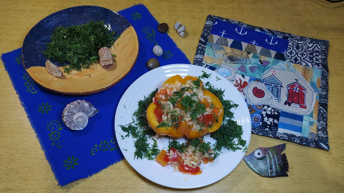 ⛵секрет морской темы в финале статьи, а в блюде рыбы нет🐟 В молодости, в студенческой общаге, полюбила готовить в одном сосуде. И просто. Как в старину - настругать всего в горшок и в печь, томиться. Опять же посуды мыть меньше. А как бы и духовку не мыть, которую вместо печи используем? Да запросто! Нам нужна лишь одна кастрюлька или глубокая сковорода. Вариативность в наборе продуктов приветствуется. Сегодня щедрая жизнь послала мне пару перцев, морковищу, луковичку, куриное бëдрышко и укроп. Один перец, самый красивый, разрезала пополам - это будут 2 "тарелочки". Порезала остальное, кроме укропа, крупными кубиками. Укроп в режиме ожидания работает украшением стола. Отправила овощи в кастрюлю с разогретым растительным маслом: лук, морковь, перец (напоминаю, этот набор может совершенно любым). Через 5-7 минут добавила курицу и немного воды (или бульона - это как вам нравится). Когда закипело - убавила огонь, далее готовила на слабом. Периодически перемешивая, готовила 30 ми