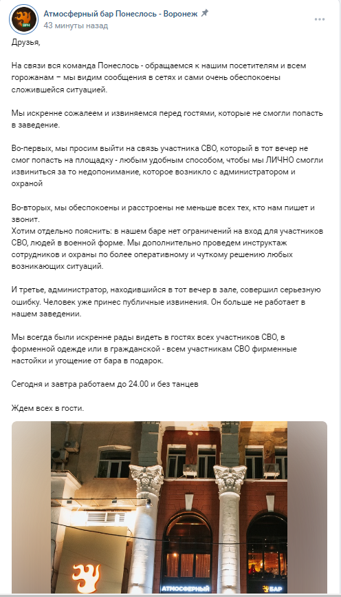 Воронежский бар «Понеслось», в который не пустили военного, впервые выступил с комментарием