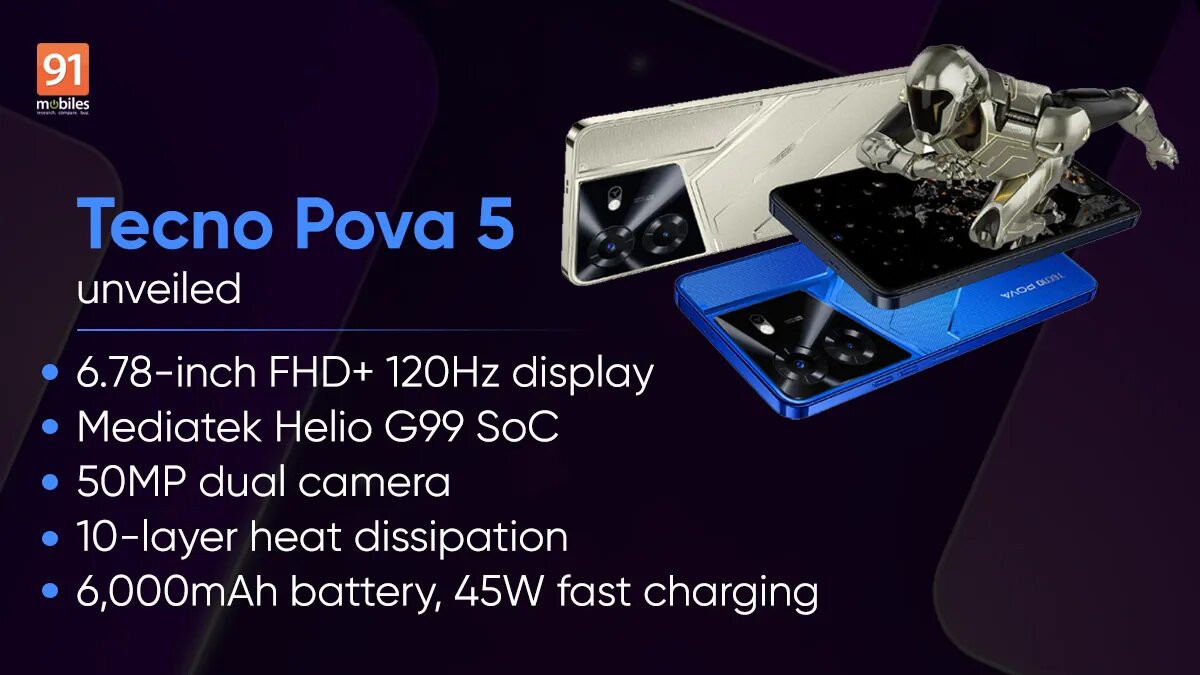Tecno представила смартфон Tecno Pova 5 , который рекламирует как «игровой и развлекательный центр». Телефон отличается поразительным дизайном на задней панели «3D Turbo Mecha» и камерой с отверстием спереди. Потребители могут выбрать один из трех оттенков : янтарно-золотой, ураганно-синий и меха-черный.