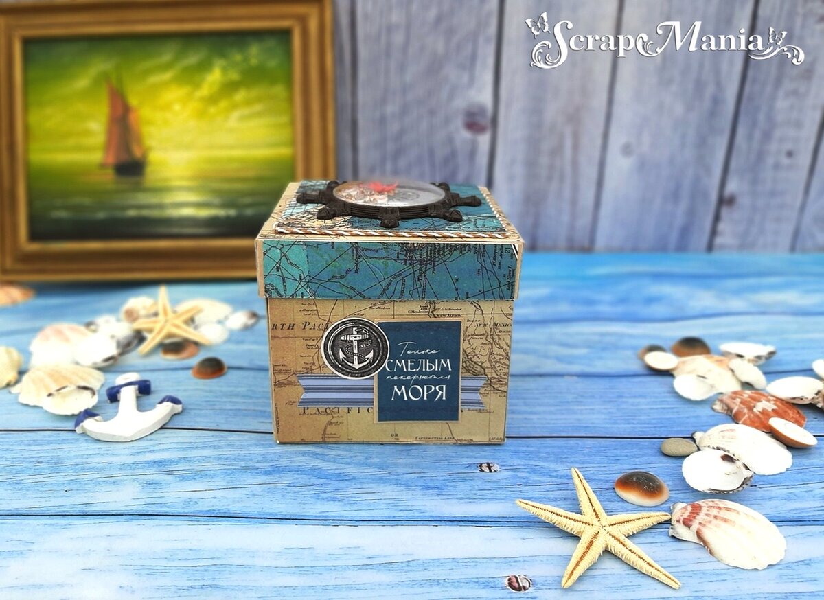 Кто видел море-тот сюда вернется.... Добрый день, с ввами Рамзиля. Лето, отдых и конечно бесконечная дорога к морю... Уже более десятки раз побывала я на море, а все оно меня манит и тянет к себе. Очень люблю когда волны бьются о скалы, крики чаек, мягкий и обжигающий песок. Вот и решила я вас вдохновить таким морским меджик-боксом о море. Коробка размером 10х10х10 см, основа из крафтового картона обклеена бумагой "Фономикс Карты Том 2" На крышке коробки пластиковый штурвал-шейкер, внутри которого натуральный морской песок и ракушки с морской звездой. Коробка открывается не полностью, а только две стороны. Главным элементом в коробке является парусник.стенка на фоне морских волн (лист с картинками "Марки9). Сам парусник -привезенный с моря магнит. Рядом "на берегу" стоит нипсовый маяк и лежит спасательный круг, сам берег покрыт песком и ракушками. На второй откидной стенке коробочки расположен кармашек для денежного подарка или сертификата, надписи и тэги вырезаны из скрап-карты