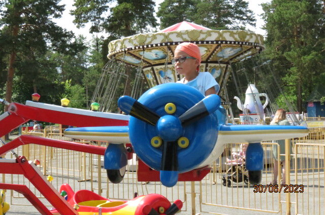 Вчера по плану был парк аттракционов имени Гагарина. Руська с нами ехать отказался. Отдых дело добровольное. Иван то же бы дома отдохнул, после вчерашнего отдыха, но без него нам никак. Решили вначале осмотреться и правильно сделали. В части парка, где детские карусели в кассу ни одного человеке, тогда как в основной части очередь часа на 1.5 и это в будний день. Взяла сразу две карты. Ребятишки вначале покатались вместе. Потом Иван остался с Полей и Егором. Егор катался на машинке, а потом собрался на детские лазилки. А я с девочками пошла на карусели. И по плану была поездка по детской железной дороге. Было очень жарко, вагончики маленькие, кондиционеров нет. В нашем вагончике один ребенок не выдержал, и на обратном пути просто впал в истерику, такую неконтролируемую, когда он ничего не слышит, ни на что не реагирует, а просто кричит на ультразвуке. Мама с папой старались, но безрезультатно. Зато когда мы вышли, то были с Иваном единогласны в мнении, что у нас очень хорошие, кул