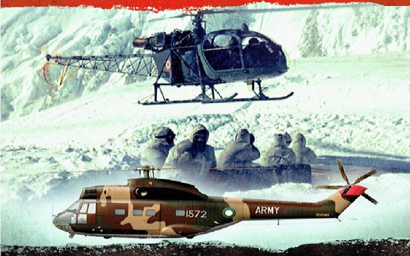 Началась всё с переброски по воздуху пехоты и снаряжения, которые были доставлены на высотные аэродромы бортами Ил-76, Ан-12 и Ан-32 ВВС Индии. Оттуда вертолетами Ми-17, Ми-8 и ХЭЛ Четак войска направлялись к востоку от самых высоких вершин ледника. Ну а дальше, как говориться, ножками. Важно понимать, что путь до вершины для индийцев был длиннее и гораздо сложнее. Пакистанская армия имеет возможность доставлять грузы на ледник по земле, а Индия - только по воздуху.