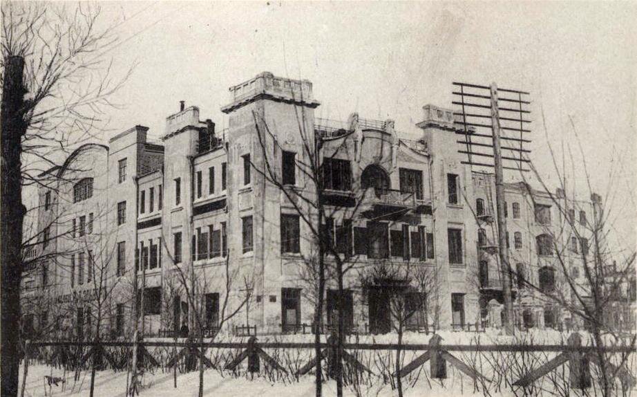 Сейчас это "задворки" Дома Эльворти. Раньше, как видно на предыдущем фото, здесь, наоборот, располагался центральный вход. Сейчас вся правая часть здания разрушена, осталось только левое крыло. А двор полностью зарос деревьями. Возможно, это те же самые деревья, что и на старом фото.