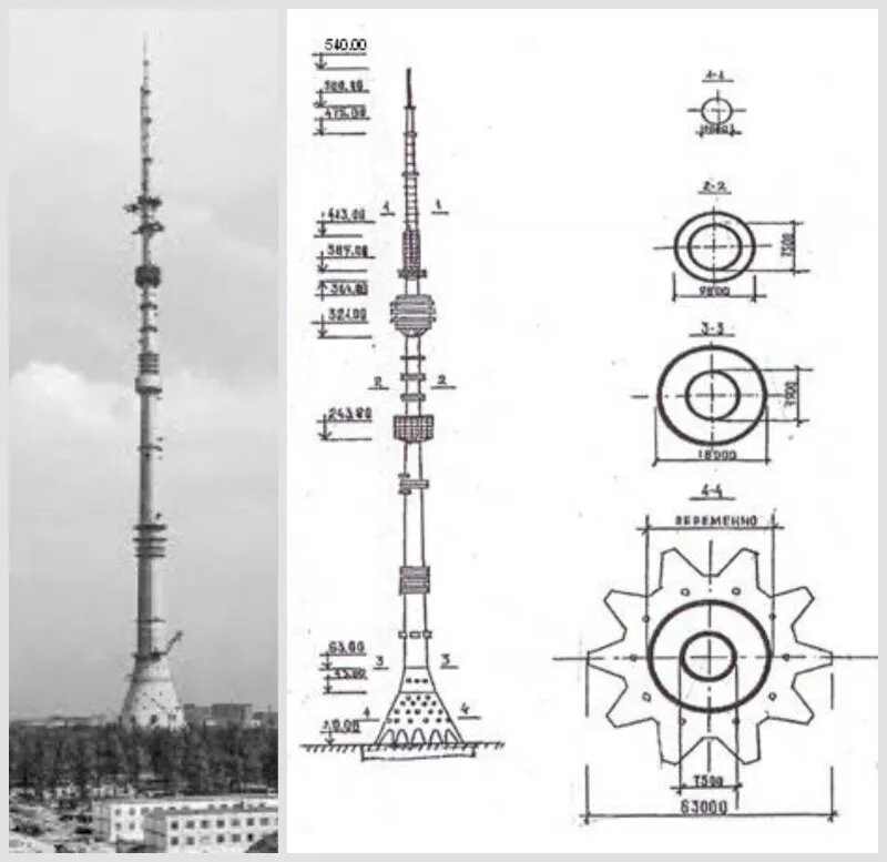 Так как в середине 50х Шуховская Башня не обеспечивала сигналом необходимую зону, было решено строить новую телебашню. И в в 1958 г. был объявлен всесоюзный конкурс, в котором победил Киевский Проектный Институт. По их задумке Башня выполнялась из стали и напоминала Эйфелеву Башню. Но в ходе обсуждения Никитин предложил строить башню из бетона по аналогии с Башней в Штутгарте (построена в 1956 г., высота 200 м.).