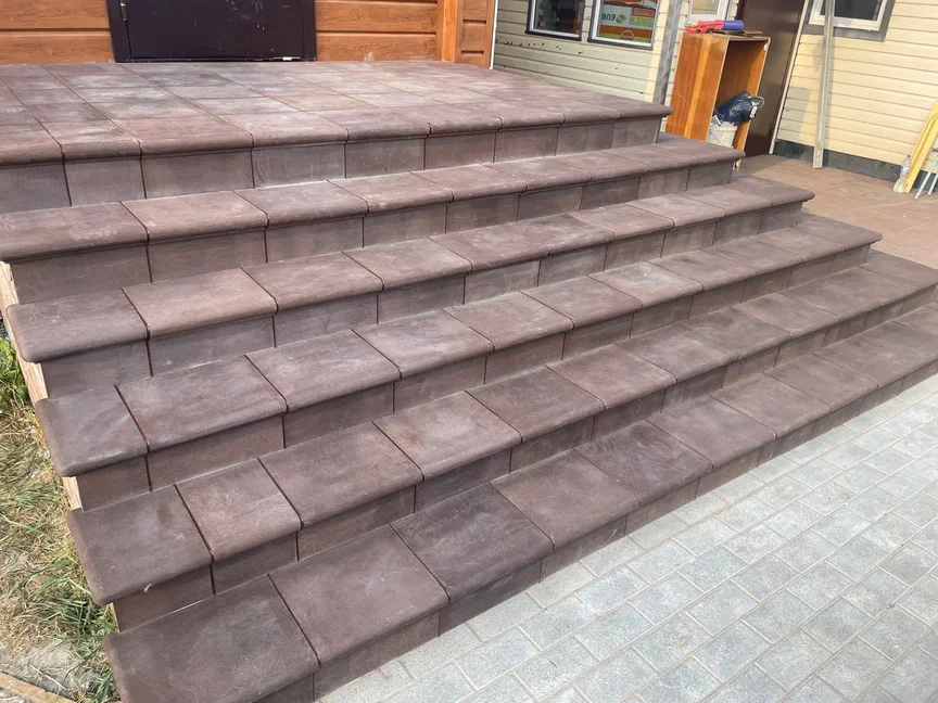 - Бережное отношение к природе. В составе плитки нет агрессивных веществ, отрицательно влияющих на атмосферу и здоровье человека. Даже при длительном воздействии направленного ультрафиолета покрытие не выделяет токсичных компонентов. В процессе эксплуатации облицованные ступени не становятся источником цементной пыли.